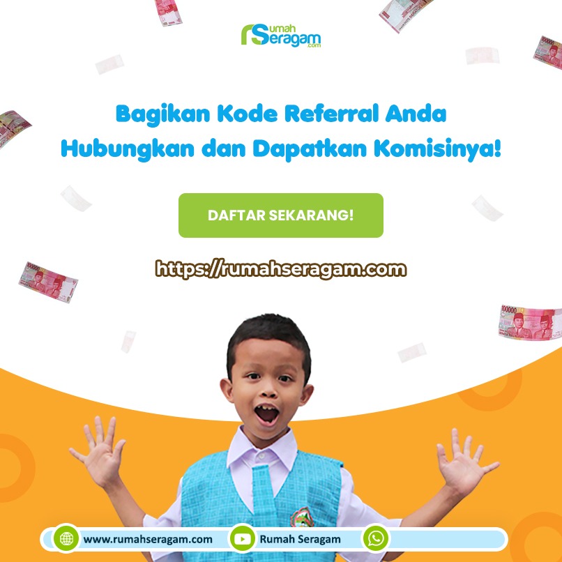 Keuntungannya cukup menarik, baik Sahabat Rumah Seragam (Pemberi Kode Referral) maupun Pengguna Kode Referral akan sama-sama mendapatkan bonus dari Rumah Seragam ketika Pengguna Kode Referral melakukan pesanan pertama ke Rumah Seragam. Pemberi Kode Referral akan mendapatkan bonus berupa Komisi Sahabat sesuai jumlah pesanan pertama Pengguna Kode.